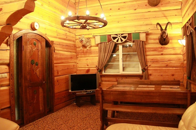 – Охотничий домик (1 номер). 2 основных места / 0 дополнительных мест. Однокомнатный номер: двуспальная кровать, кресло-кровать, мини-бар, сейф, телефон, телевизор. Санузел: душевая кабина или ванна, раковина, фен, халат, тапочки, набор полотенец, умывальные принадлежности (зубная щетка, зубная паста, разовое мыло, разовый шампунь), унитаз. Площадь номера: 30 кв.м.
