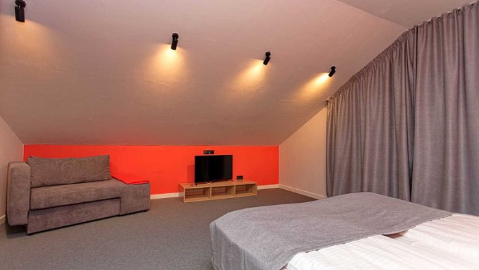 Апартаменты (1 номер). 4 основных места / 4 дополнительных места (предоставляются на раскладных диванах). Трехкомнатный номер с кухонной зоной. Гостиная, совмещенная с кухонной зоной: диван, открытый шкаф, столик. Кухонная зона: холодильник, посудомоеная машина, варочная панель, вытяжка, микроволновая печь, чайник, кухонная посуда, столовые приборы. Обеденная зона: стол, стулья. Две спальни, в каждой: двуспальная кровать, прикроватные тумбы, односпальный диван, телевизор. Санузел: душ, раковина, зеркало, унитаз, фен, гель, шампунь, набор для гигиены полости рта. Площадь номера: 72 кв.м.