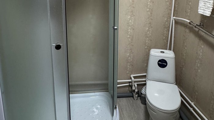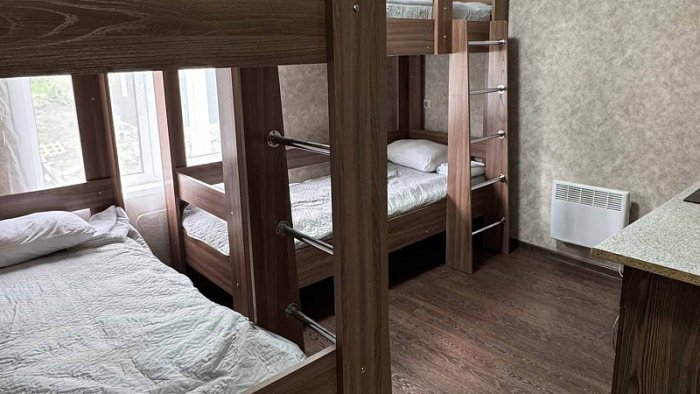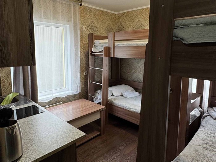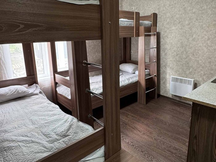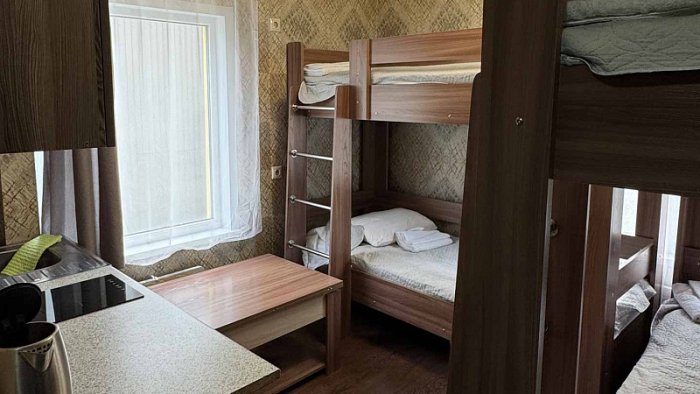 - Студия эконом (3 номера). 4 основных места / 0 дополнительных мест. Однокомнатный номер: две двухъярусные односпальные кровати, вешалки-крючки для верхней одежды, стеллаж, стол, кухонная зона (чайник, микроволновая печь, мини-холодильник, варочная панель, набор посуды и столовых принадлежностей). Санузел: душевая кабина, раковина, зеркало, фен, одноразовая косметика, унитаз. Площадь номера: 18 кв.м.
