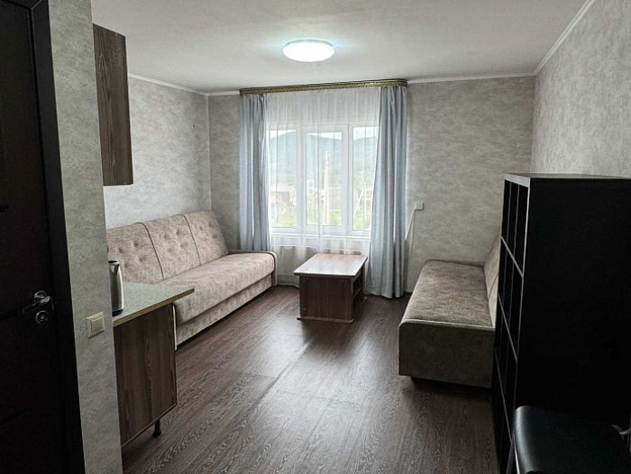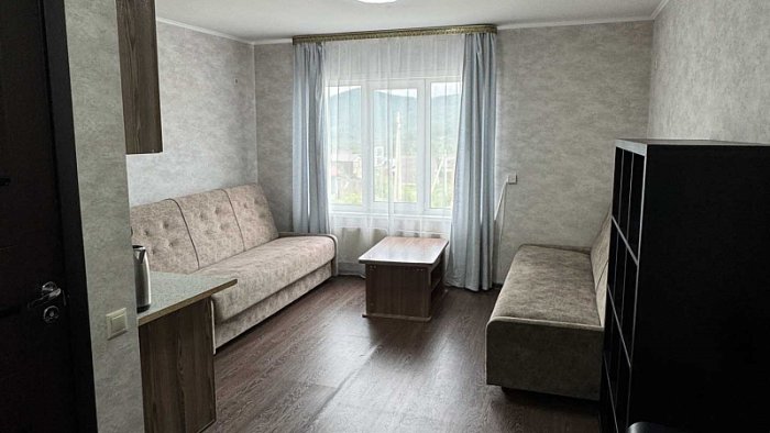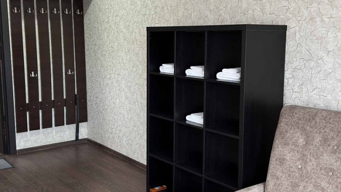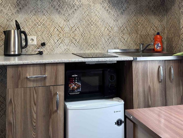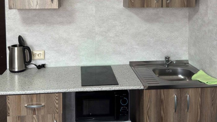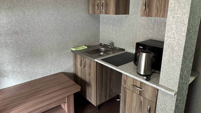 - Студия комфорт (2 номера). 2 основных места / 2 дополнительных места (предоставляются на диване). Однокомнатный номер: два дивана, вешалки-крючки для верхней одежды, стеллаж, стол, кухонная зона (чайник, микроволновая печь, мини-холодильник, варочная панель, набор посуды и столовых принадлежностей). Санузел: душевая кабина, раковина, зеркало, фен, одноразовая косметика, унитаз. Площадь номера: 24 кв.м.