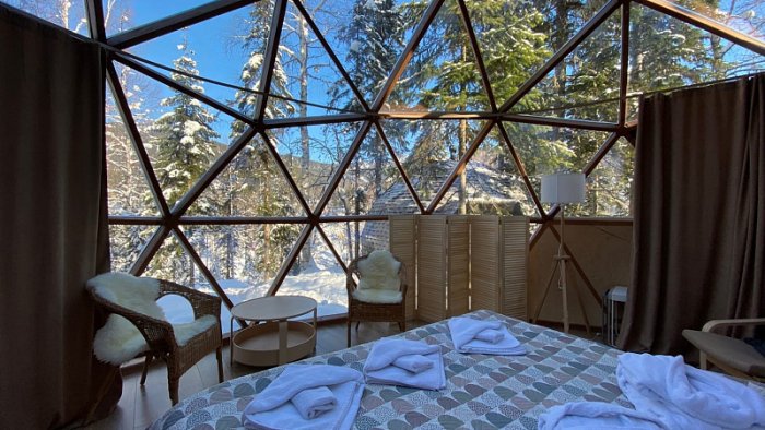 – Иглу (12 домов). 3 основных места / 1 дополнительное место (предоставляется на матрасе). Входная зона: антресоль с кухонным инвентарем (СВЧ-печь, холодильник, чайник, посуда для 4 гостей), вешалки, тумба. Номер: кровать, прикроватные столики, кресло, столик, стулья, ширма, зеркало, торшеры, настольные лампы. Антресоль (спальная ниша): матрас. Санузел: душ, раковина, зеркало, фен, халаты, тапочки, душевые принадлежности, зубные наборы, унитаз. Внимание: нет телевизора, кухонной зоны, варочной поверхности, мультиварка по запросу. Мангальная зона на территории комплекса (мангалы, решетки по запросу). Площадь иглу: 34 кв.м.