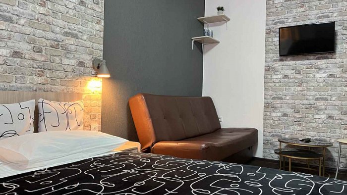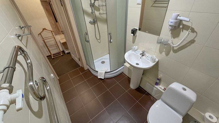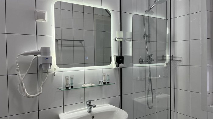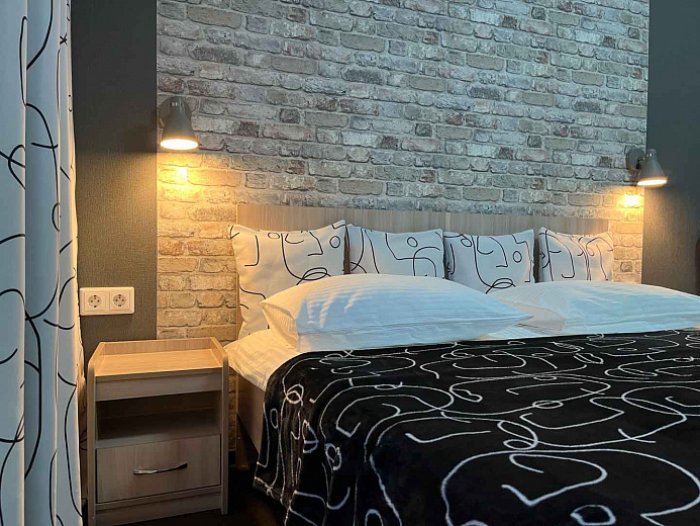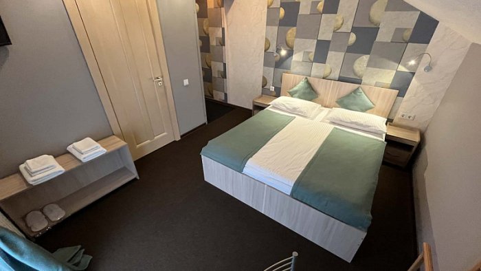 – Стандарт + (2 номера). 2 основных места / 0 дополнительных мест. Однокомнатный номер: двуспальная кровать, прикроватные тумбы, диван, шкаф с полками, вешало, стол, стулья, телевизор. Санузел: душ, раковина, зеркало, фен, тапочки, косметические и гигиенические средства, унитаз. Площадь номера: 15 кв.м.