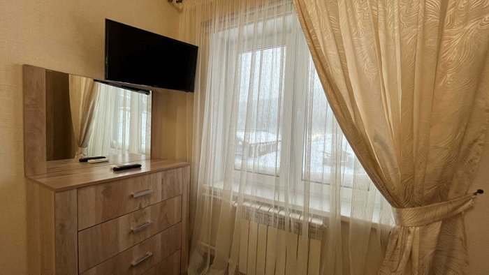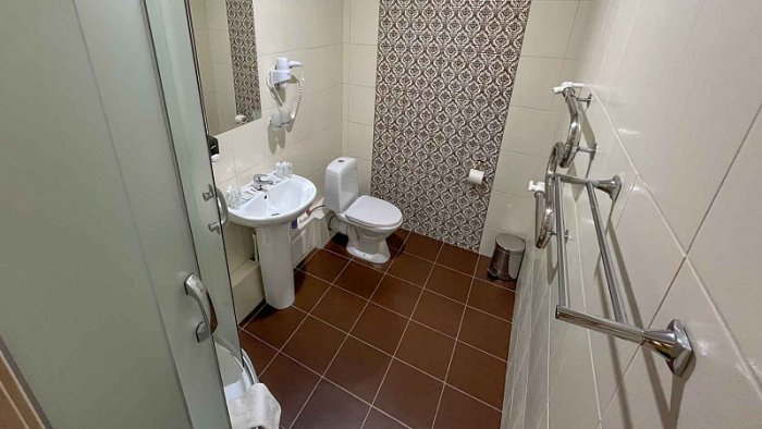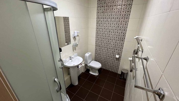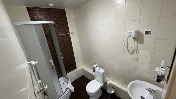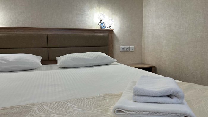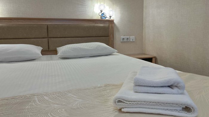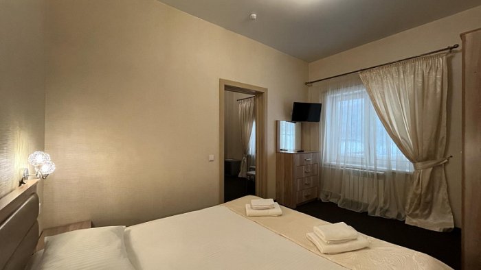 – Комфорт (1 номер). 2 основных места / 0 дополнительных мест. Однокомнатный номер: двуспальная кровать, прикроватные тумбы, тахта, шкаф, багажная полка, стол, стулья, чайник, телевизор. Санузел: душ, раковина, зеркало, фен, тапочки, косметические и гигиенические средства, унитаз. Площадь номера: 15 кв.м.