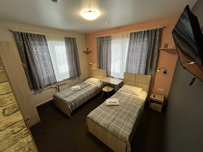 – Стандарт (5 номеров). 2 основных места / 0 дополнительных мест. Однокомнатный номер: двуспальная кровать, прикроватные тумбы, шкаф открытый с полками, вешало, стол, стулья, телевизор. Санузел: душ, раковина, зеркало, фен, тапочки, косметические и гигиенические средства, унитаз. Площадь номера: 12 -15 кв.м.– Стандарт (2 номера). 1+1 основных места / 0 дополнительных мест. Однокомнатный номер: две односпальные кровати, прикроватные тумбы, шкаф открытый с полками, вешало, стол, стулья, телевизор. Санузел: душ, раковина, зеркало, фен, тапочки, косметические и гигиенические средства, унитаз. Площадь номера: 12 -15 кв.м.