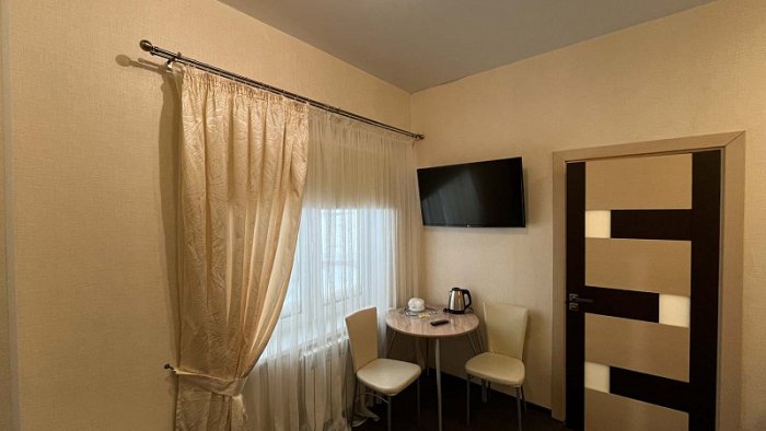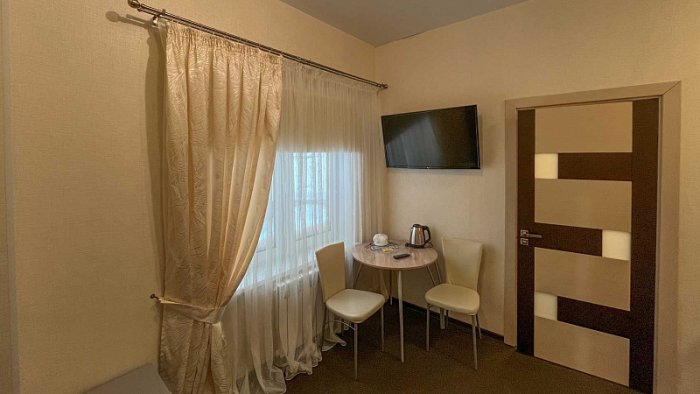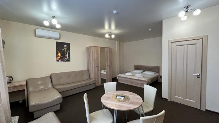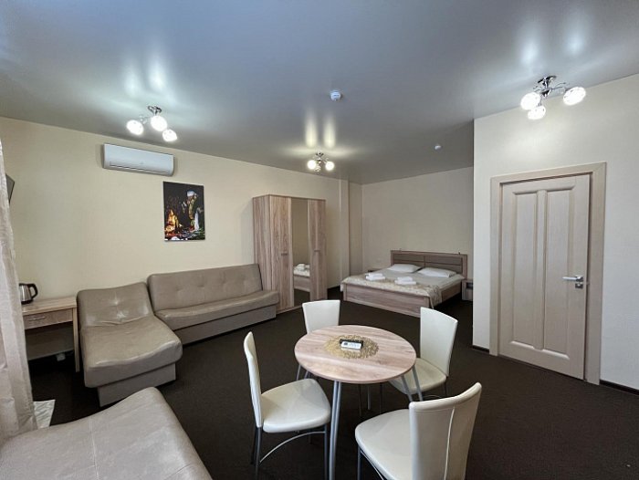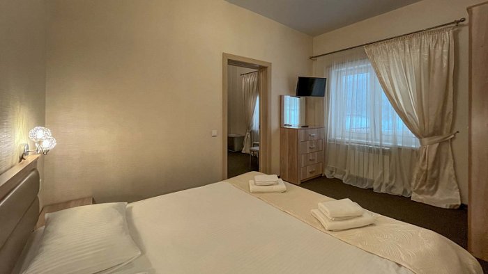 – Люкс (1 номер). 2 основных места / 0 дополнительных мест. Двухкомнатный номер. Гостиная: мягкая мебель, стол, стулья, кондиционер, мини-холодильник, чайник, чайные пары, телевизор. Спальня: двуспальная кровать, прикроватные тумбочки, шкаф, комод, телевизор. Санузел: душ, раковина, зеркало, фен, халаты, тапочки, косметические и гигиенические средства, унитаз. Площадь номера: 40 кв.м.