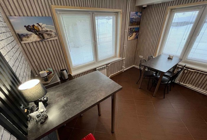– Апартаменты (гостевой дом) (1 номер). 6 основных мест / 0 дополнительных мест. Гостиная: односпальная двухъярусная кровать, диван, кресла, шкаф, журнальный столик, обеденный стол, лавки, телевизор. Кухонная зона: гарнитур, варочная панель, холодильник, микроволновая печь, чайник, набор посуды, кулер с водой. Мезонин (общая зона): две двуспальные кровати. Душевая (отдельная). Санузел: душ, раковина, зеркало, фен, халаты, тапочки, косметические и гигиенические средства, унитаз. Сауна. Площадь номера: 80 кв.м.