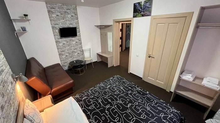 Однокомнатный номер: двуспальная кровать, прикроватные тумбы, тахта, шкаф, багажная полка, стол, стулья, чайник, телевизор.