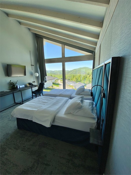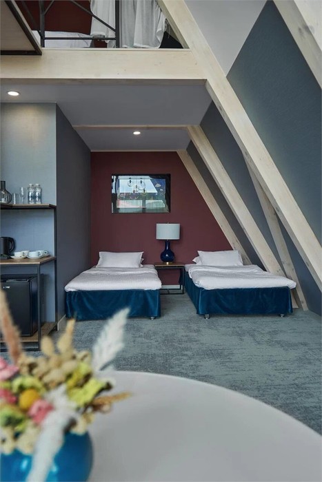 2-этажное шале с террасой | 4 осн | 2 | 2-спальная, две 1,5-спальные | 65 м2, 2-уровневый номер (винтовая лестница, не рекомендуется размещение с детьми до 6 лет) гостиная (1 этаж): спальная зона, зона отдыха с диваном, столик, стулья, сейф, телевизор, секция для хранения вещей, мини-холодильник, чайник, кондиционер спальная комната (мансарда): тумбочки, терраса |