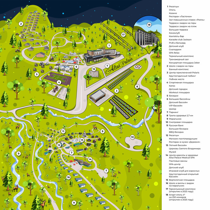 современные шале и виллы комплекса «Altai Palace» (отель и коттеджи, казино, термальный комплекс, караоке-холл, проводятся шоу-программы и концерты, летняя зона отдыха с бассейном, спортивная площадка)