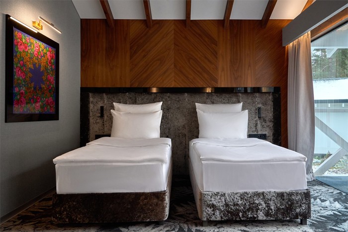 2 осн | 1 | две 1-спальные | 38 м2 номер с возможностью объединиться с категорией Шале Dabl Коннект в один большой номер панорамные окна, прикроватные столики, вешалка для одежды, шкаф, столик, два кресла, телевизор, мини-бар, чайник, кофейная станция, сейф, кондиционер, телефон терраса (стол, стулья) |