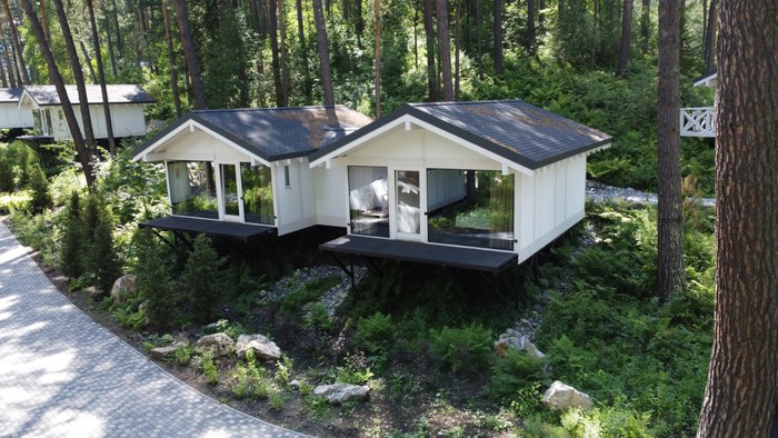 1-этажное шале на 2 номера с отдельным входом и террасой. Между номерами имеется переход, который может быть закрыт, либо открыт, если номера были объединены в один большой номер по запросу Свернуть