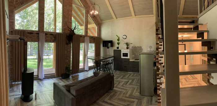 отдельностоящий 2-этажный дом с панорамными окнами с террасой | 6 осн | 3 | 2-спальная/две 1-спальные (кровать-трансформер), три 1-спальные, диван | 100 м2, панорамные окна, холл 1 этаж: диван, камин, кухонная зона (холодильник, плита, духовка, чайник), бранная стойка, телевизор, спальная комната (комод) 2 этаж: гардероб, прикроватные тумбочки, комод, кресло |