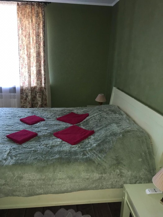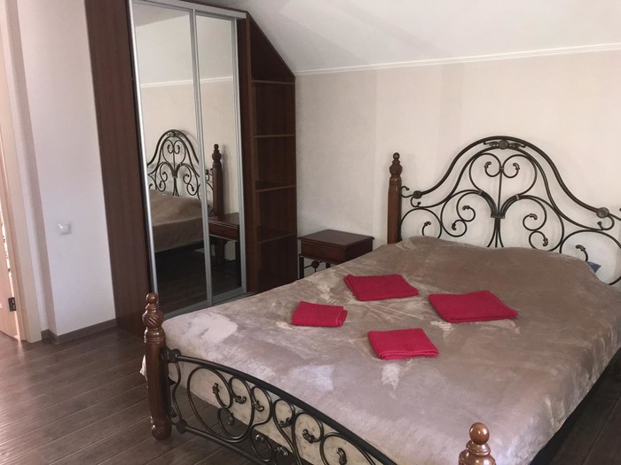 3 | две 2-спальные | 80 м2 1 этаж: : гостиная с витражными окнами и выходом на террасу (стол, лавочки), диван, телевизор, оборудованная кухонная зона (кухонный гарнитур, холодильник, свч-печь, плита, вытяжка, раковина, заварник, чайник, обеденный стол на 6 человек, набор посуды) 2 этаж: две спальные комнаты, прикроватные тумбы, шкаф, телевизор, в одной из них кресло-кровать и выход на балкон |
