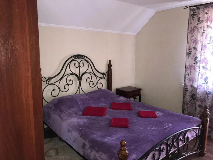 60 м2 1 этаж: гостиная с витражными окнами, диван, телевизор, мини-холодильник, раковина, микроволновая печь, чайник, набор посуды, спальня 2 этаж: спальня, прикроватные тумбочки |