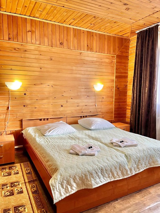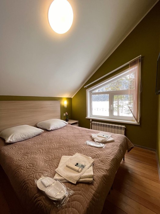 Отдыхали в августе семьей 3 человека 2 ночи. Хочется отметить в первую очередь завтраки, сытные и вкусные, голодным не уйдешь. В номере есть все необходимое, чистенько. Но вот кровать, лишний раз не хочется шевелится, скрепит очень сильно. База находиться в красивом месте, озеро рядом. В номере тепло, спали с открытой дверью. В общем неплохо.