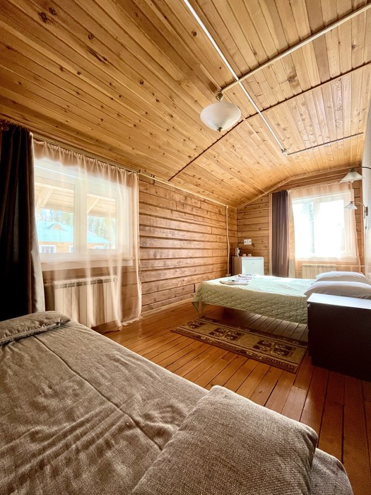 2-этажный коттедж, корпус 3, над баней | 2 осн | 1 | две 1-спальные | 9 м2, прикроватные тумбочки, шкаф, телевизор в общем блоке на 3 номера: оборудованная кухня (кухонный гарнитур с мойкой, эл. плита, микроволновая печь, холодильник, чайник, набор посуды, стол, табуреты) |