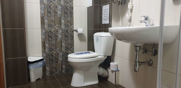 в общем блоке на 2 номера: туалет, умывальник, душевая кабина