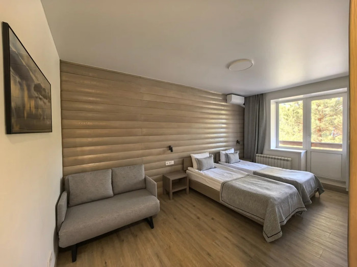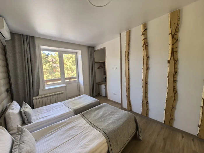 1 | 2-спальная | 40 м2, вешалка, прикроватные тумбочки с бра, столик, диван, стол, стулья, вешалка, телевизор, мини-холодильник, чайник? кондиционер | туалет, умывальник, душ, халаты, набор полотенец, фен | нет | диван |