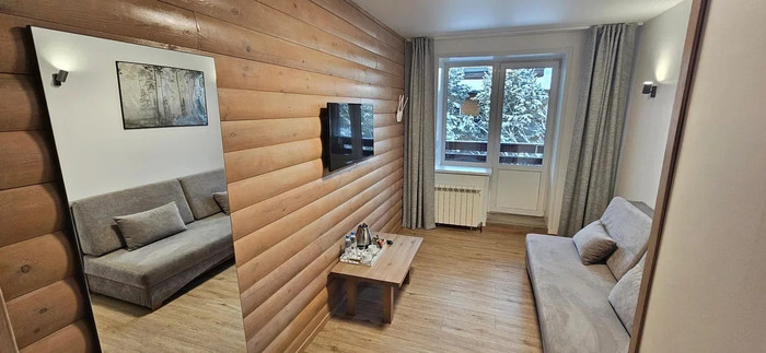3 | две 2-спальные | 65 м2, 2 спальни: вешалка, прикроватные тумбочки с бра, в одной из спален кресло гостиная: столик, диван, кресло, телевизор, кухонная зона, мини-холодильник, микроволновка, чайник, теплый пол |