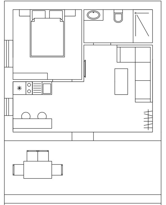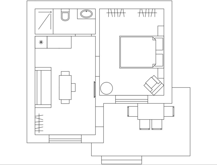 балкон (два стула, столик), терраса (стул, скамейка, подвесное кресло) | диван, 1-спальный диван |