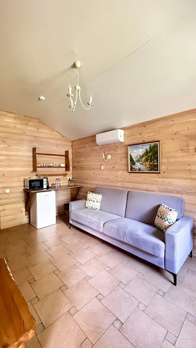 2 | 2-спальная | 40 м2, камин, вешалка, прикроватные тумбочки с бра, пуфик, столик, диван, кресло, вешалка, телевизор, мини-холодильник, чайник, кондиционер | туалет, умывальник, душ, халаты, набор полотенец, фен | терраса | диван |