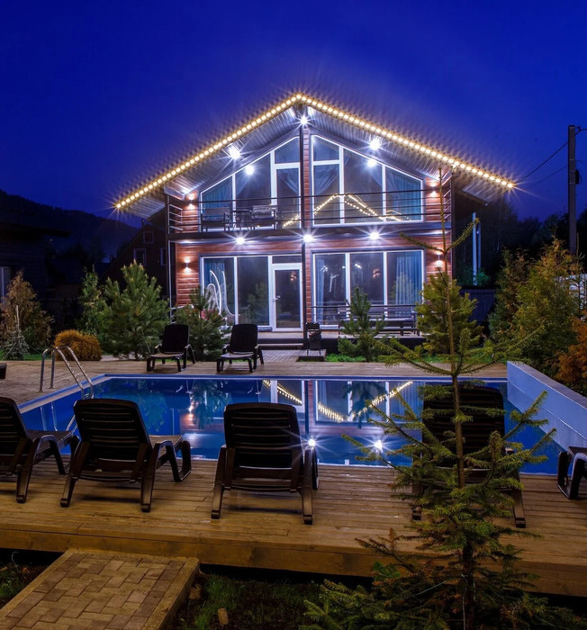 отдельностоящий 2-этажный коттедж с панорамными окнами, собственным крытым бассейном с видом на горы | 4 осн 4 доп |