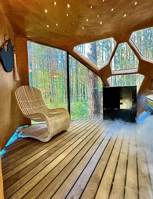 34 кв.м, панорамные окна, прикроватные тумбочки, мягкая мебель, столик, телескоп, кондиционер, теплый пол, телевизор, акустическая система, дополнительный отопительный конвектор, печь-камин, мини-холодильник, микроволновка, чайник, набор посуды