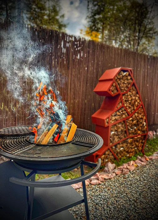 в мангальной зоне - мангал, дрова, щепа для розжига, решетки для гриля, уличная мебель, терраса