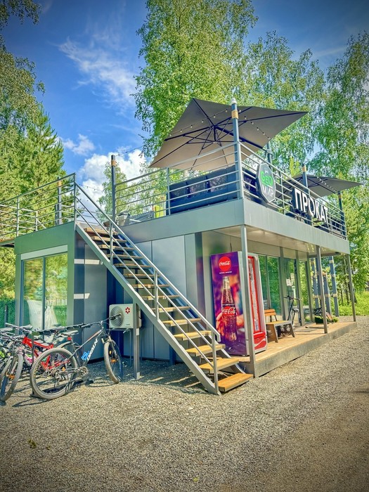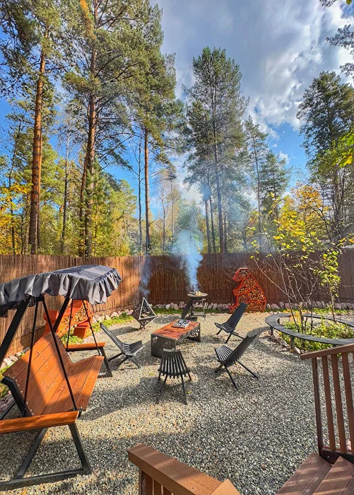современная база отдыха с уникальным архитектурным стилем, где дома выполнены в форме геометрических фигур, есть lounge-зона для массовых мероприятий, сама база расположена в сосновом реликтовом лесу с видом на горы, в шаговой доступности от озера Манжерокского и развлекательного кластера Манжерок