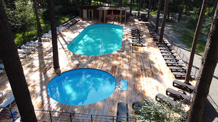 Достойный уровень!!! Великолепная уютная территория в сосновом лесу, где каждый найдет себе место для отдыха: беседки, качели, детские площадки, большой бассейн с теплой водой даже в сентябре, прекрасный ландшафтный дизайн , место для костра с грилем... Территория объединена с отелем Алтика, что дает