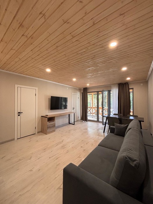 2 | 2-спальная, 1-местный диван, кресло-кровать | собственная мангальная зона в гостиной: шкаф для одежды, набор мягкой мебели, журнальный столик, телевизор, кухонная зона (мини-кухня с мойкой и электроплитой, чайник, холодильник, печь СВЧ, набор посуды), столовая зона (стол, мягкие стулья) в спальной комнате: прикроватные тумбочки, стол, телевизор |