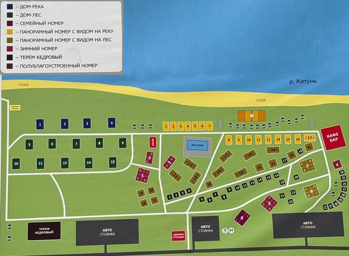 благоустроенные номера в отдельных домиках или на 2-4 номера (Панорама река, Панорама река+, Панорама лес работают с мая по октябрь) благоустроенные номера в отдельных домиках (Дом река, работают круглогодично) благоустроенные номера в коттеджах на 2-4 номера (Семейный, Б+, Панорама лес + работают круглогодично) благоустроенные номера в гостиничном корпусе (СТ, СТ+, СТ 2-ур., Студия, работают с мая по сентябрь) частично благоустроенные отдельностоящие домики (ПБ, Д, работают с мая по август) |